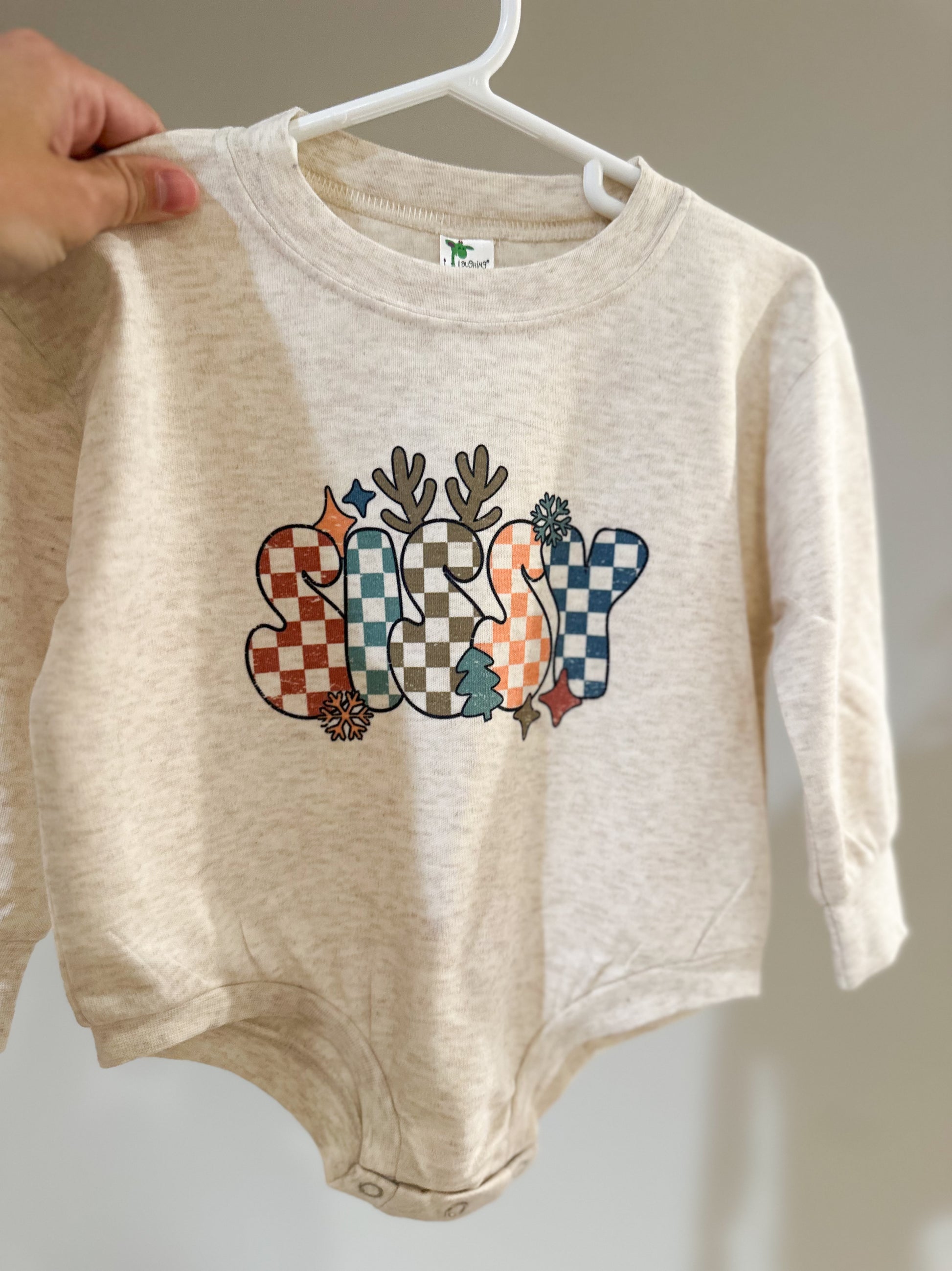 Design shown on oatmeal long sleeve snap bubble.