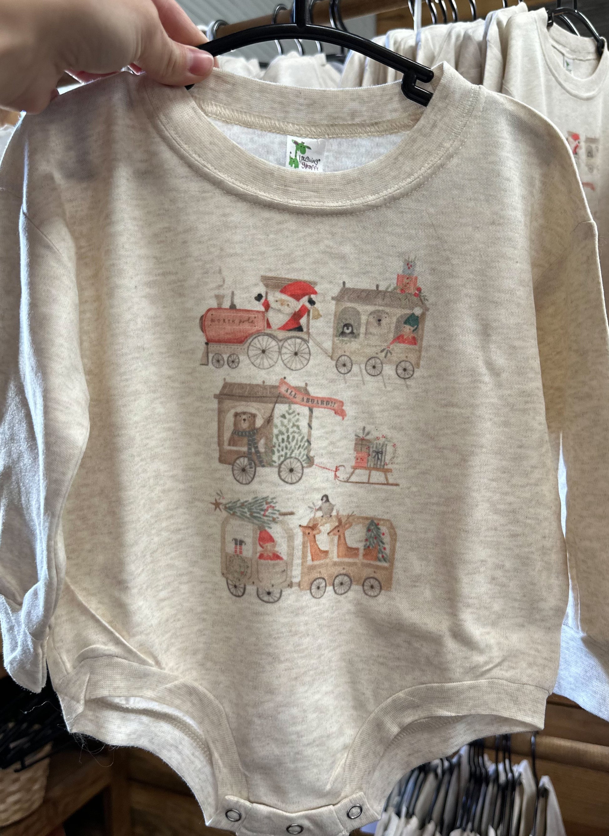 Design shown on oatmeal long sleeve snap bubble.