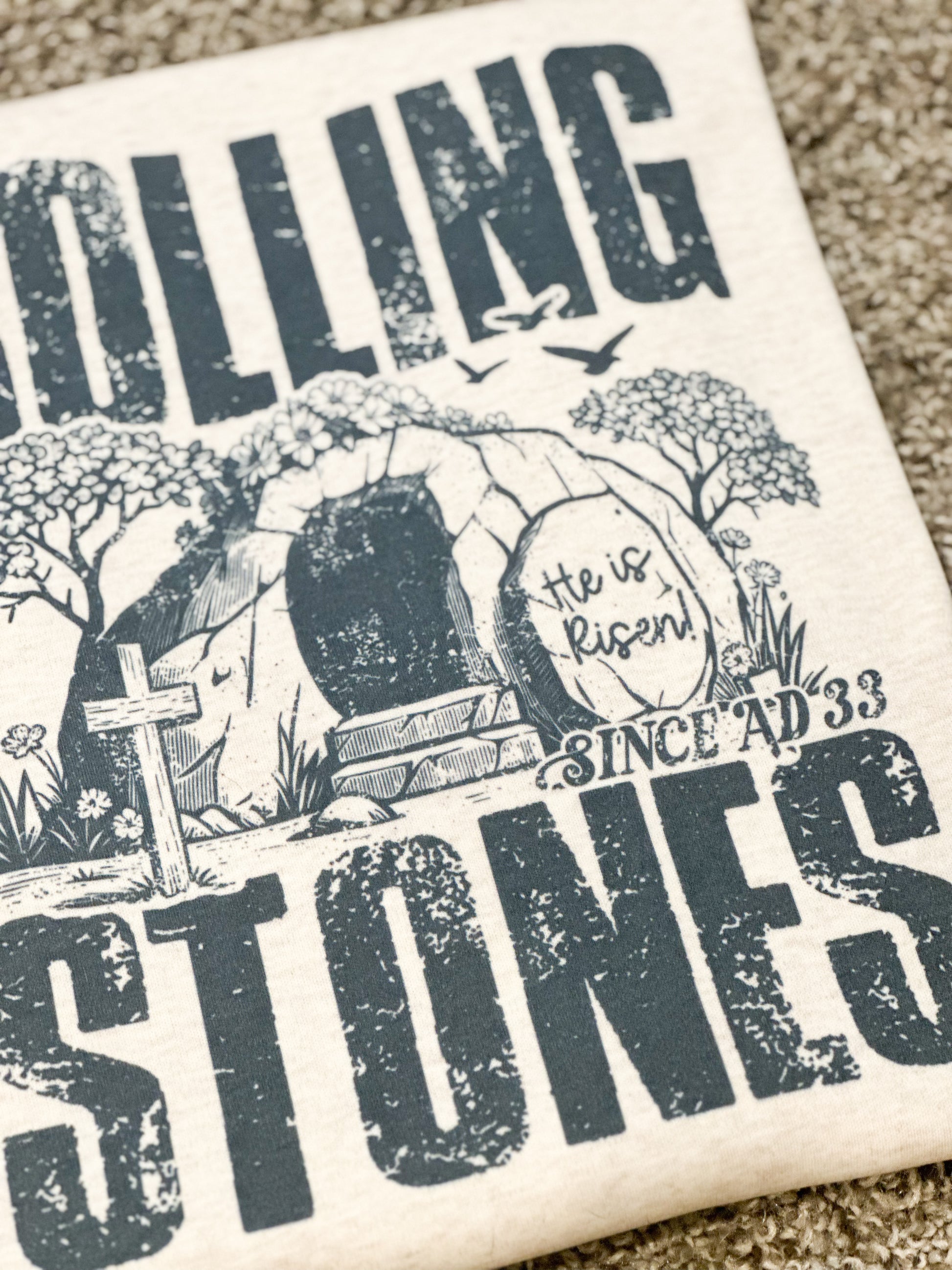 Oatmeal, white, and heather gray tees are a buttery soft material made of 65% polyester 35% cotton. These tees will begin to have a washed worn look after several washes.
